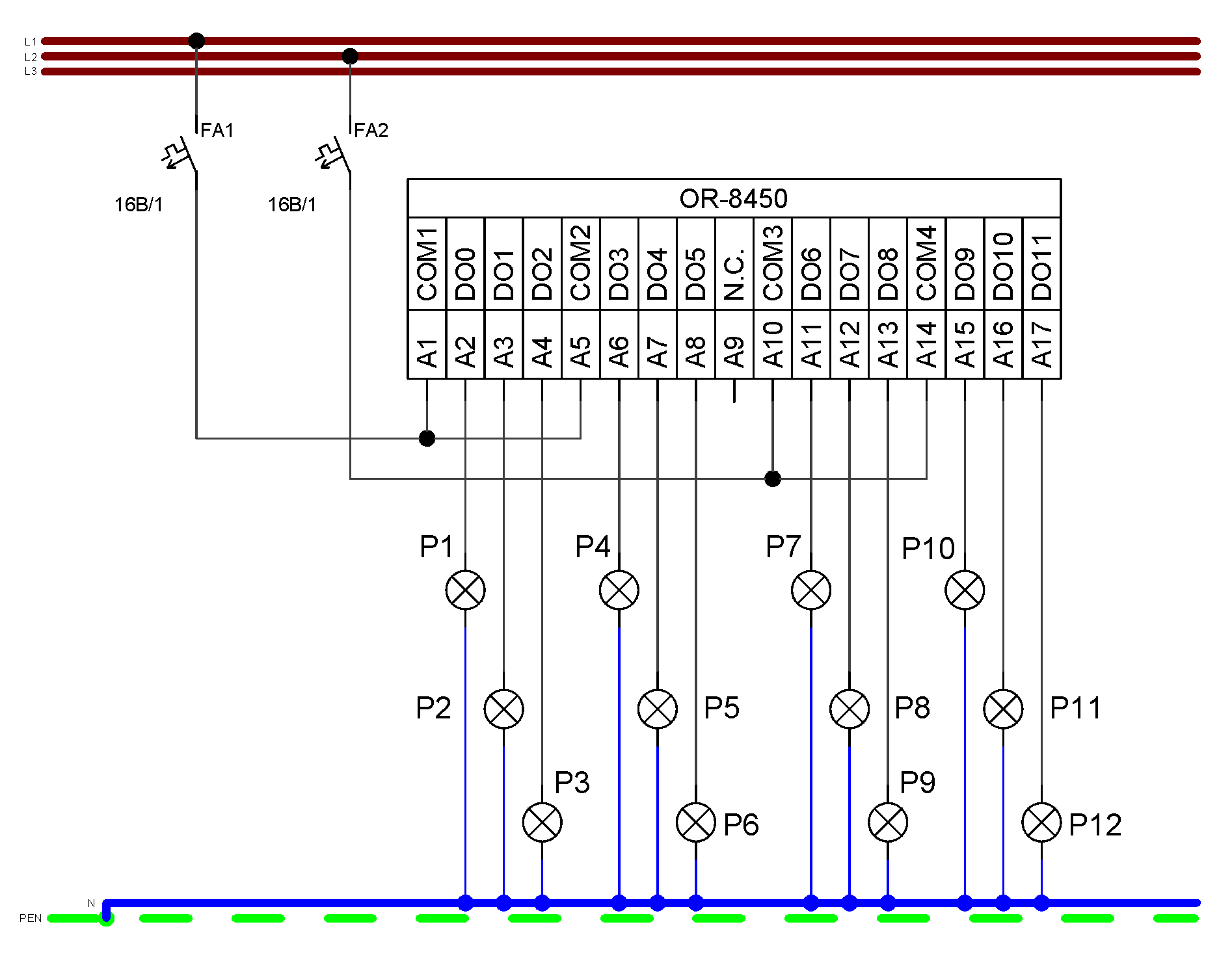 Modul OR-8450 je vybaven 12 reléovými výstupy se spínacími kontakty. Modul je osazen bezšroubovým vyjímatelným konektorem 17 svorek se zajištěním po zasunutí do modulu. Jednotlivé výstupy je možné zatěžovat trvalým proudem až 3 A (nesmí se překročit max. proud společné svorky skupiny 8 A)
