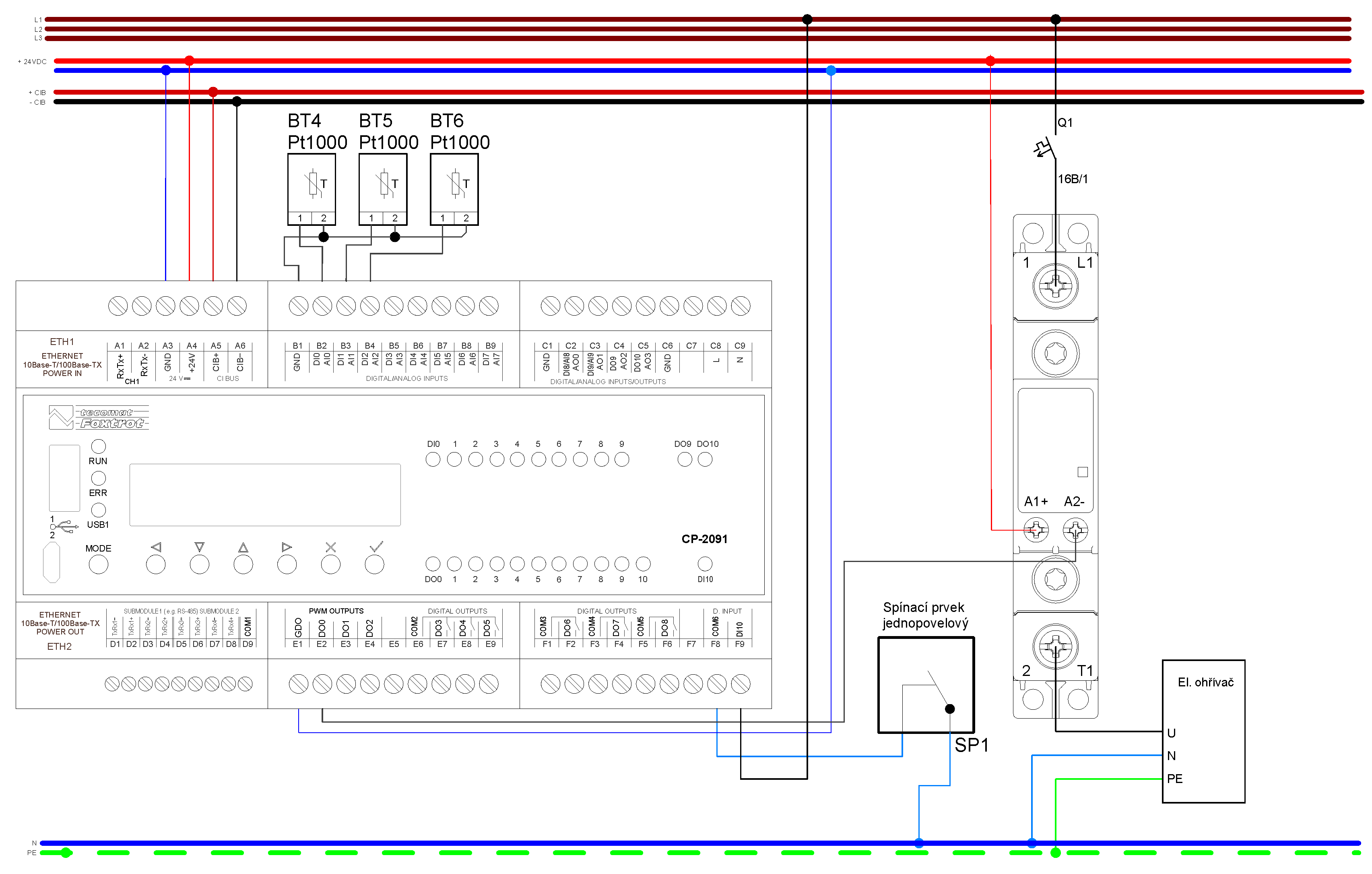 Základní modul CP-2091 umožňuje napájení z 24 VDC, nebo 230 VAC (typická hodnota napětí).