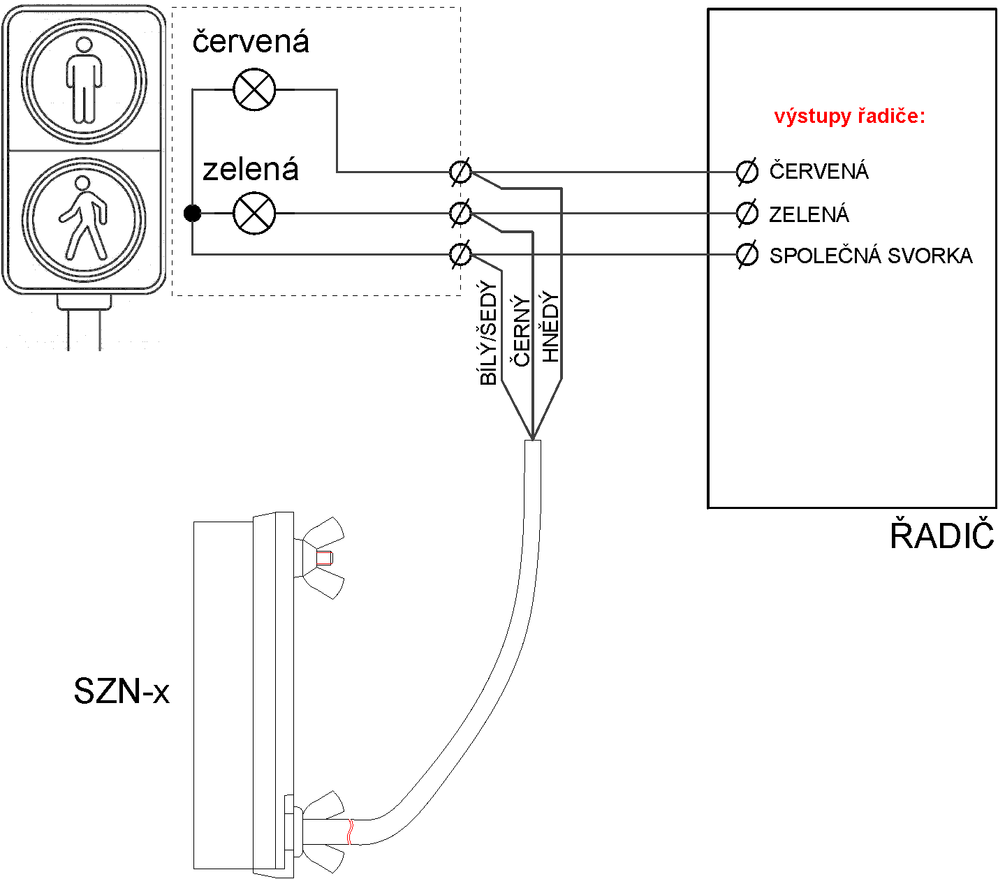 Obr. 1 připojení SZN-x na svorky světelné signalizace ("semaforu pro chodce")