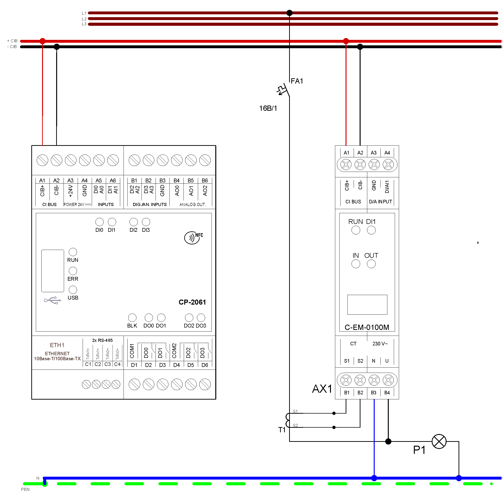 Obr. 1 Základní příklad zapojení elektroměru C-EM-0100M