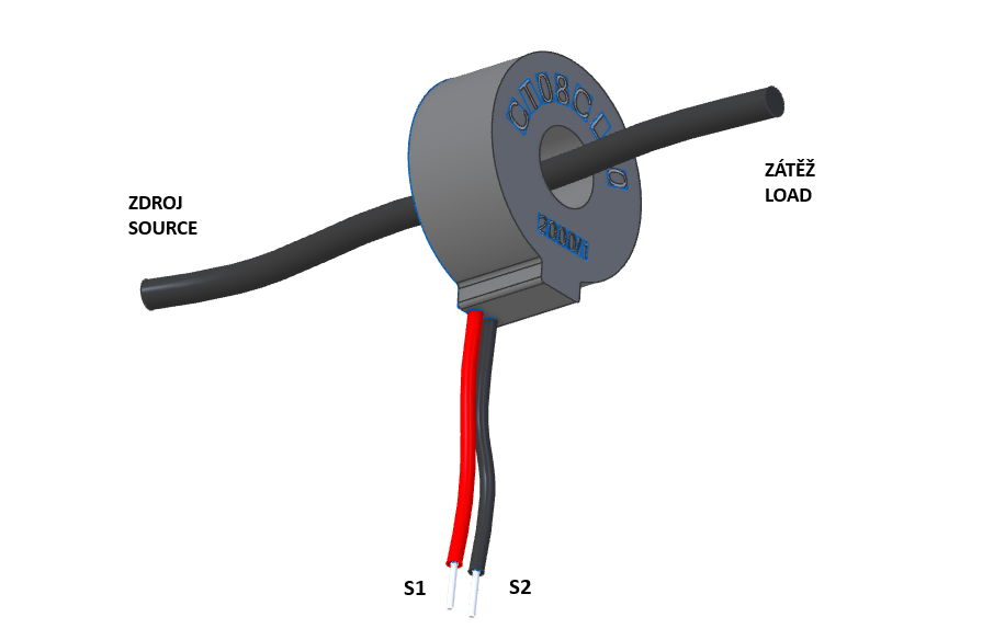 Modul je standardně dodáván s proudovým transformátorem s převodem 2000:1 a měřicím rozsahem do 50 A AC.